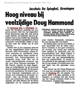 - Free funk/avant-garde jazz drummer, composer en dichter Doug Hammond met een trio. Een “schot in de roos van de stichting” dit verrassend concert vindt een enthousiaste Eddy Determeijer in het Nieuwsblad de volgende dag.